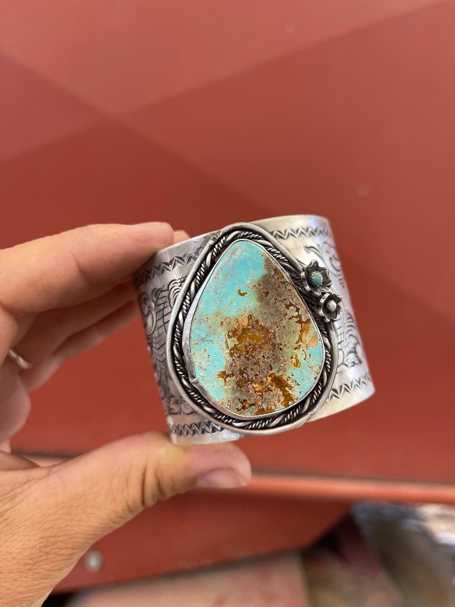 LARGE chunk of Royston turquoise sits centerpiece. Two hand made sterling silver accent flowers and double border surround stone.