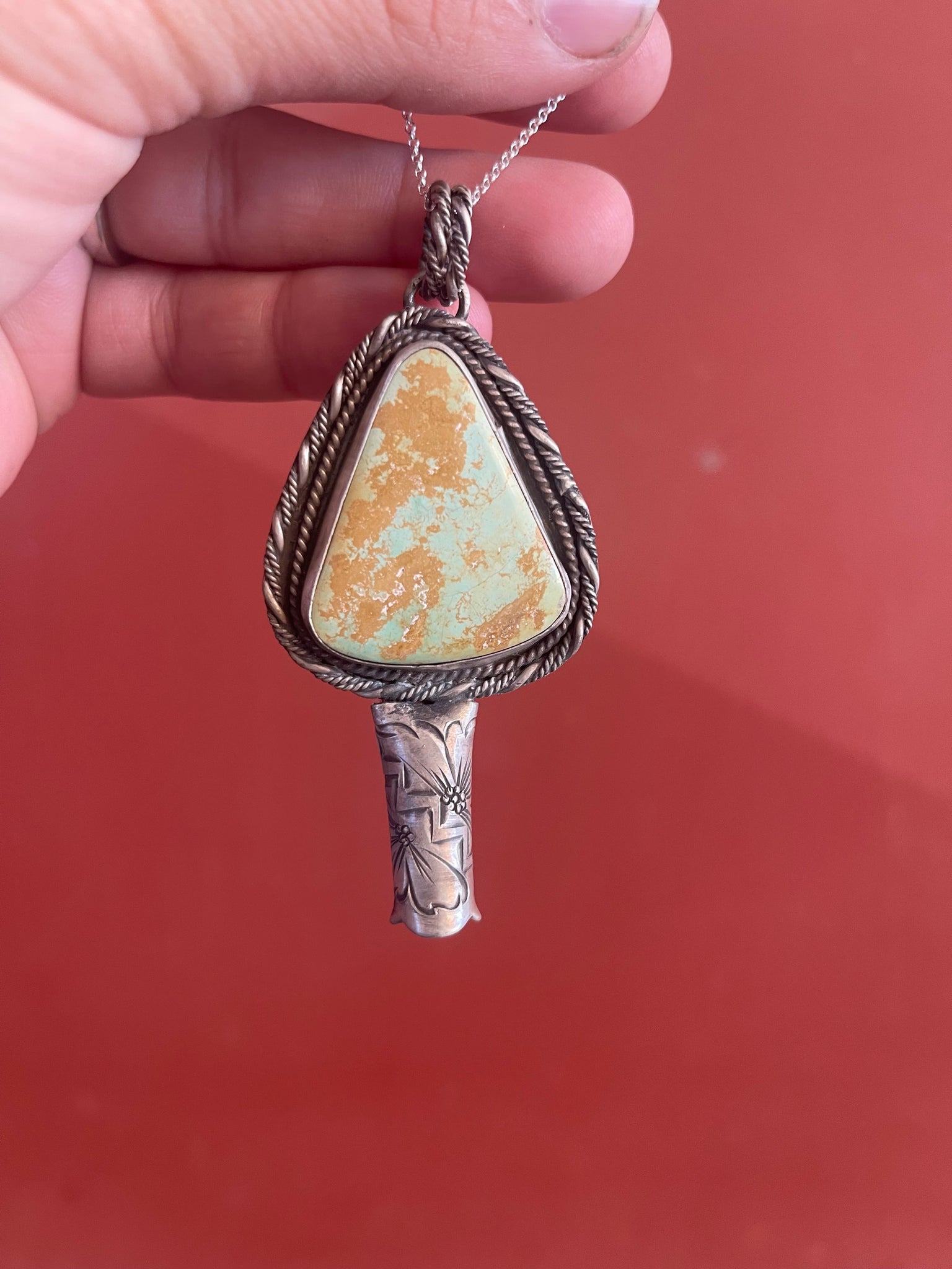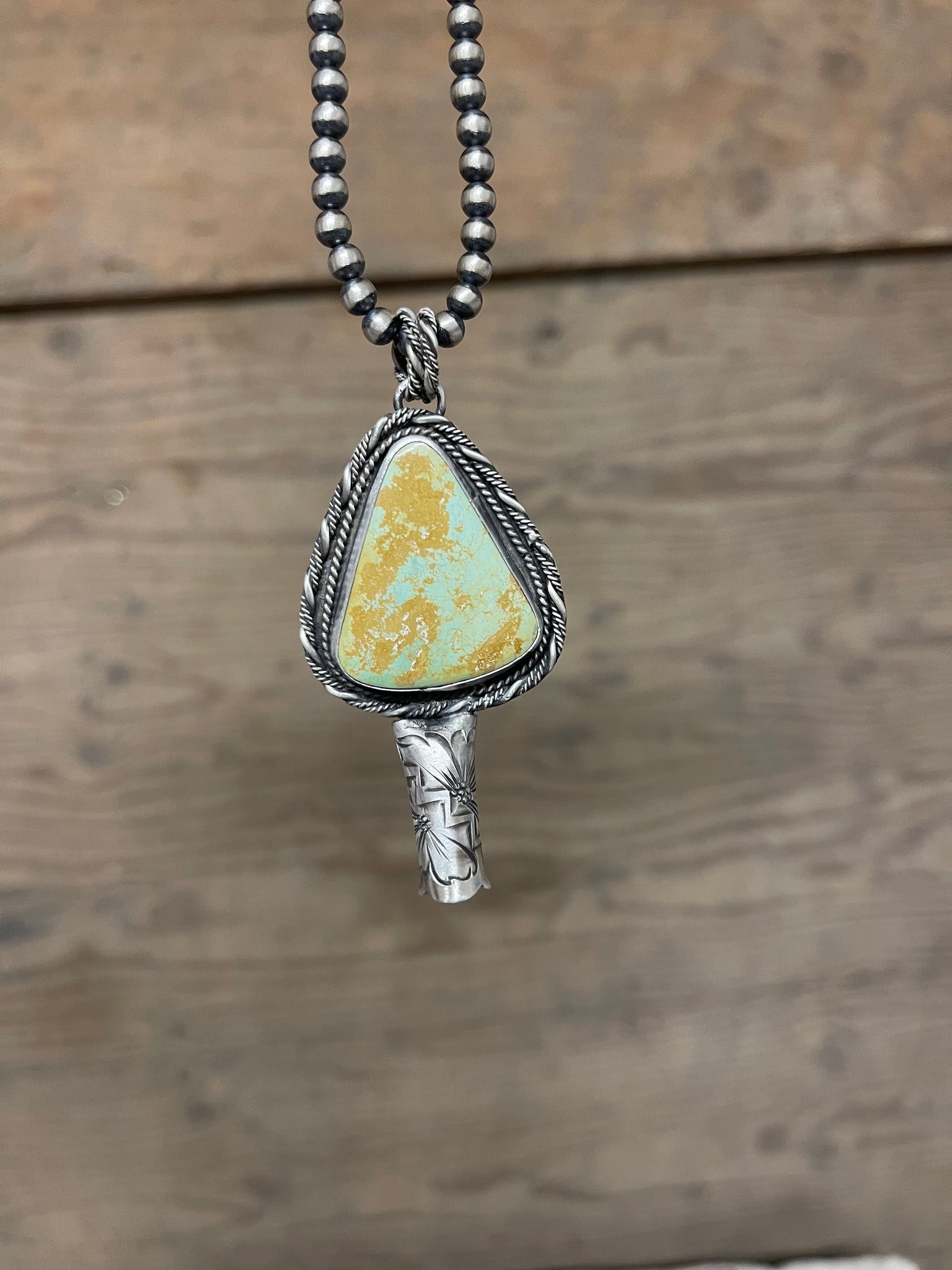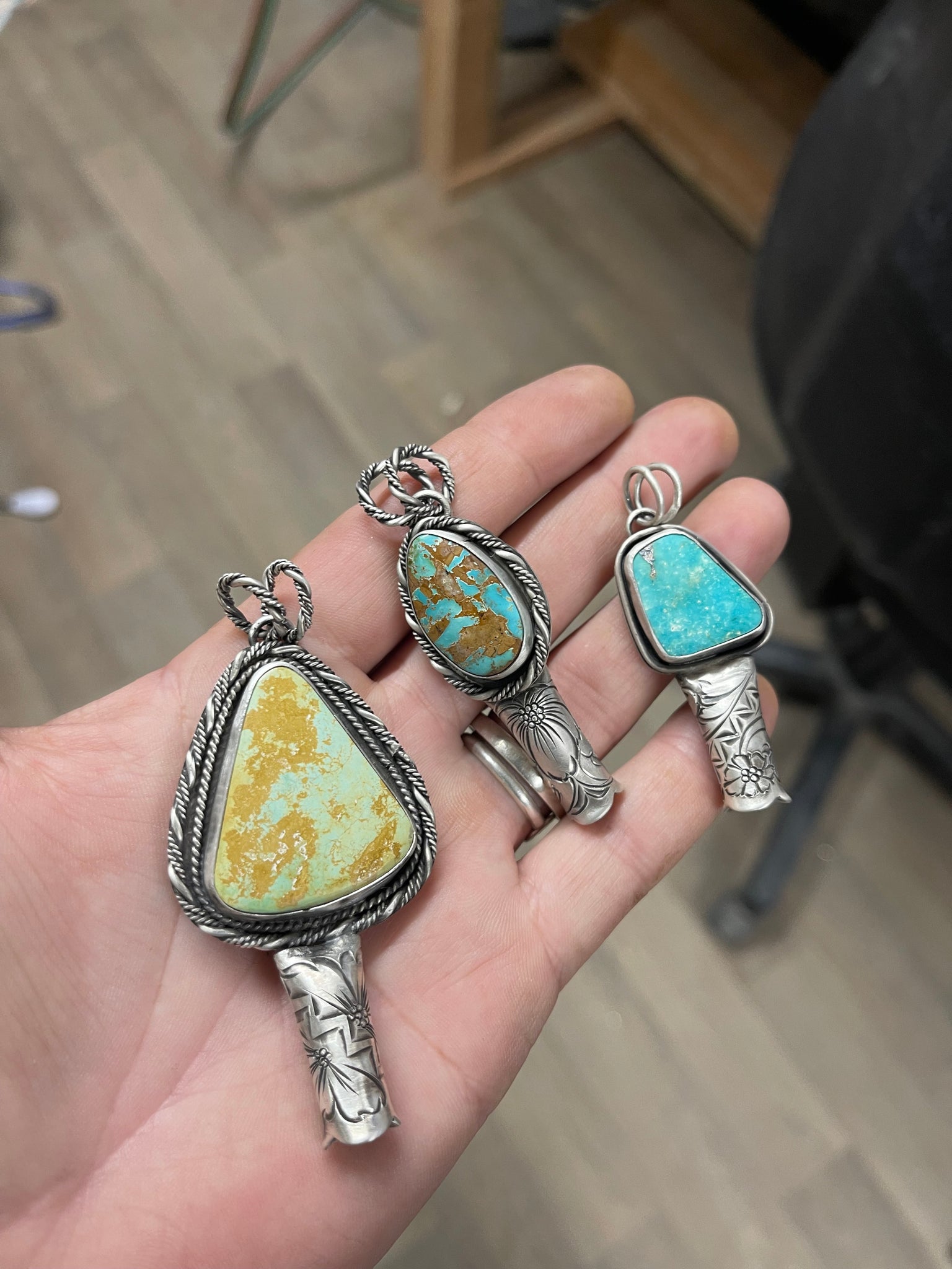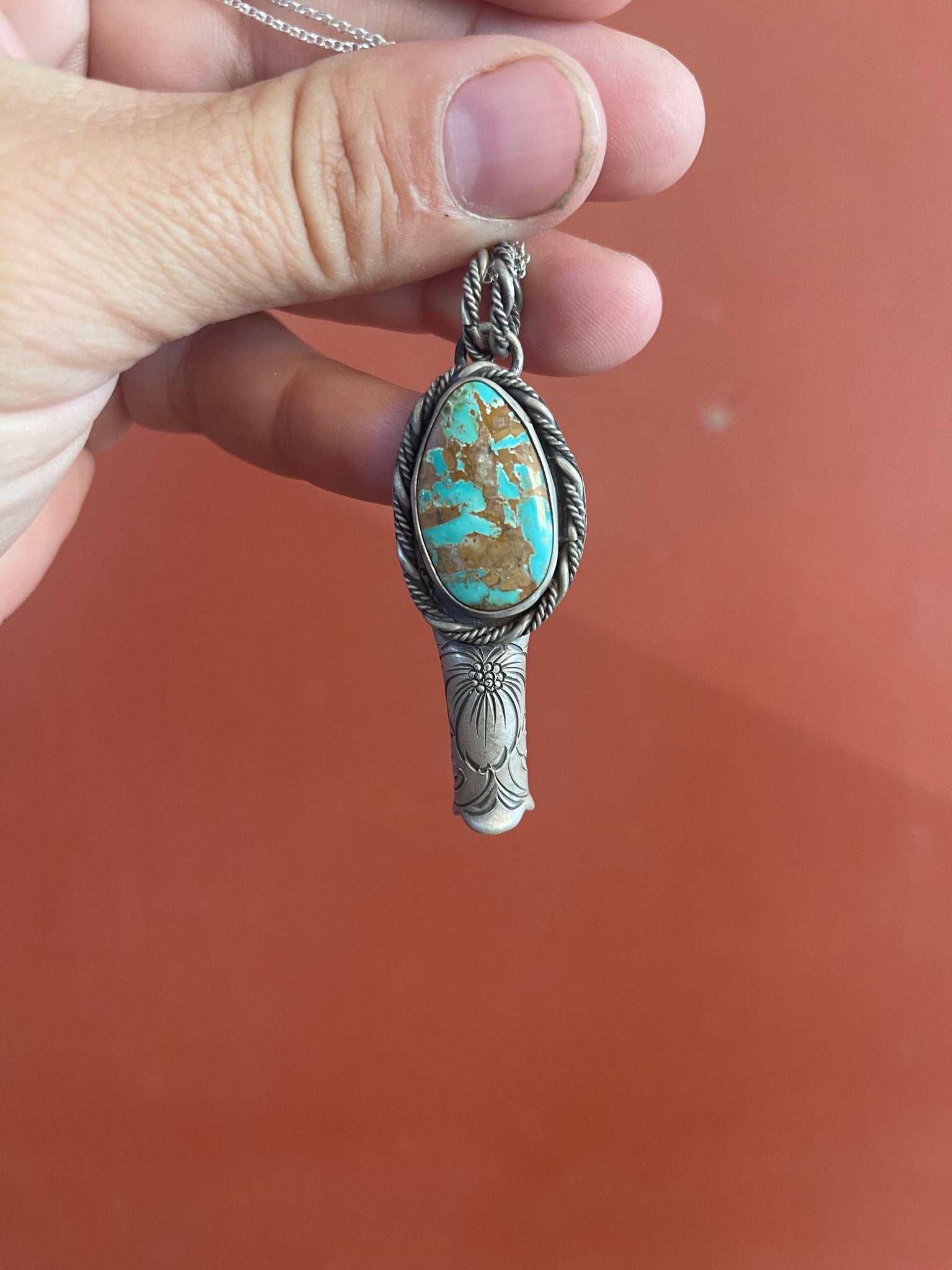 B. Natural Pilot Mtn turquoise with engraved blossom